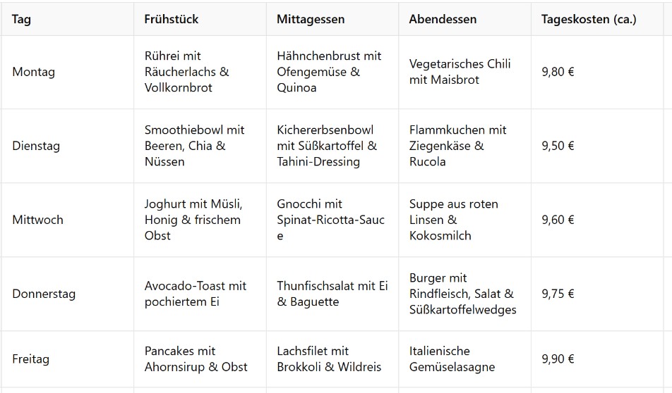 Wer häufiger vorkocht, Reste verwertet und Angebote nutzt, kann das System sogar noch günstiger gestalten – und sich dabei genussvoll, bewusst und abwechslungsreich ernähren.