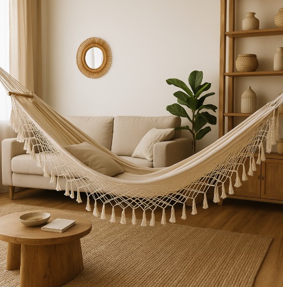 Abseits des funktionalen Aspekts ist eine Hängematte auch ein ästhetisches Element. In großen Räumen schafft sie eine entspannte Atmosphäre, in kleineren kann sie eine Lese- oder Ruhezone ersetzen. Modelle aus Naturstoffen wie Baumwolle oder Leinen fügen sich harmonisch in moderne Wohnstile ein, während farbenfrohe Varianten Akzente setzen.