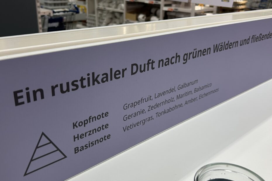 Bei Ikea kommen häufig Noten wie Zedernholz oder Vanille zum Einsatz, die den Raum mit einer ruhigen, wohnlichen Stimmung füllen. Diese Basisdüfte wirken harmonisierend und verbinden sich gut mit Möbel- oder Textilgerüchen.