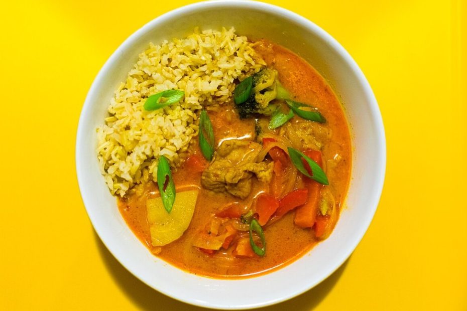 Linsencurry mit Karotten, Brokkoli und Vollkornreis. Als Getränk ein Glas stilles Wasser.